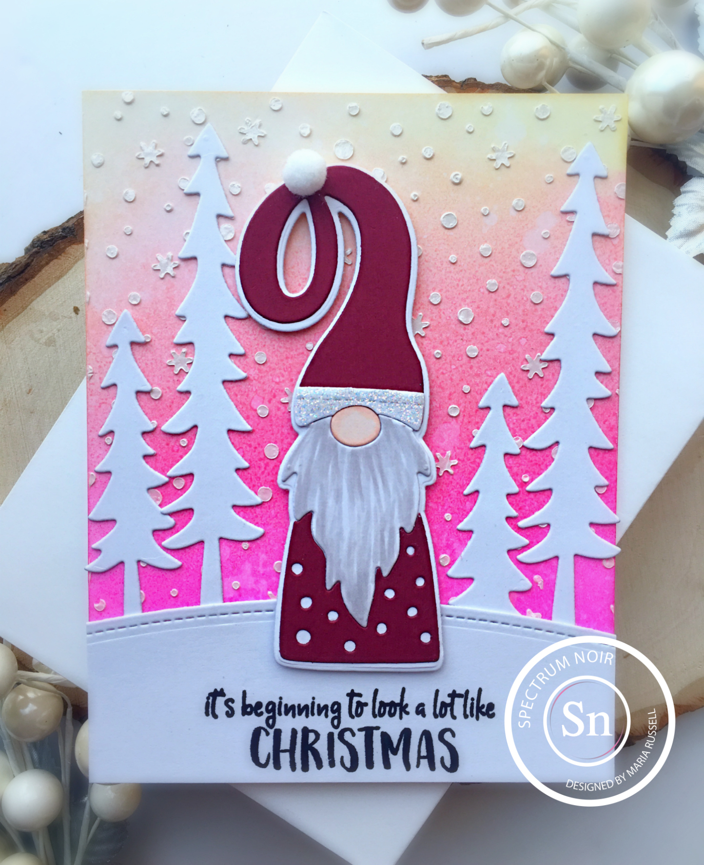 Hello Spectrum Noir fans! Maria Russell here with you today from the Spectrum Noir tutorial design team. I am up on the blog sharing this cute Gnome Christmas card, showcasing some SN Harmony Water-Reactive Inks to create my winter background and SN Classique Markers.