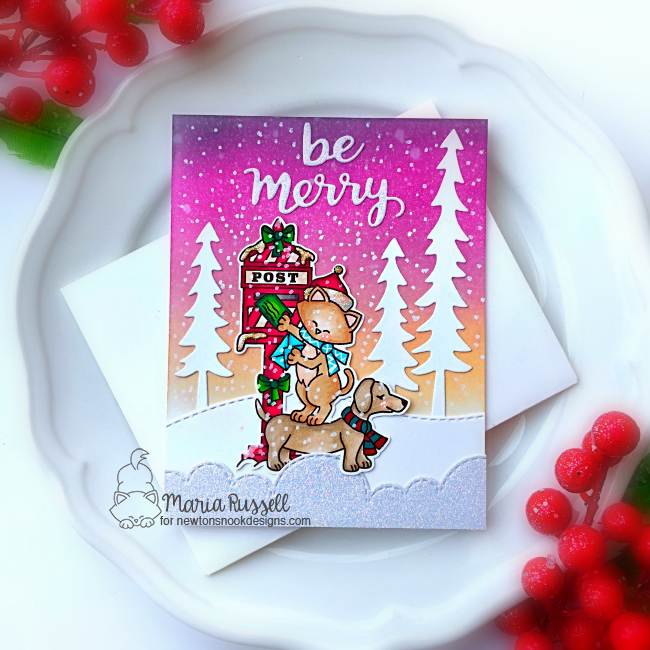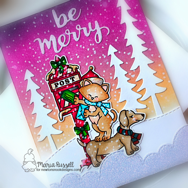 I die-cut the trees using the Forest Builder die set by Newton’s Nook Designs and the snow hill using Lawn Fawn’s Stitched border die on some white card stock.