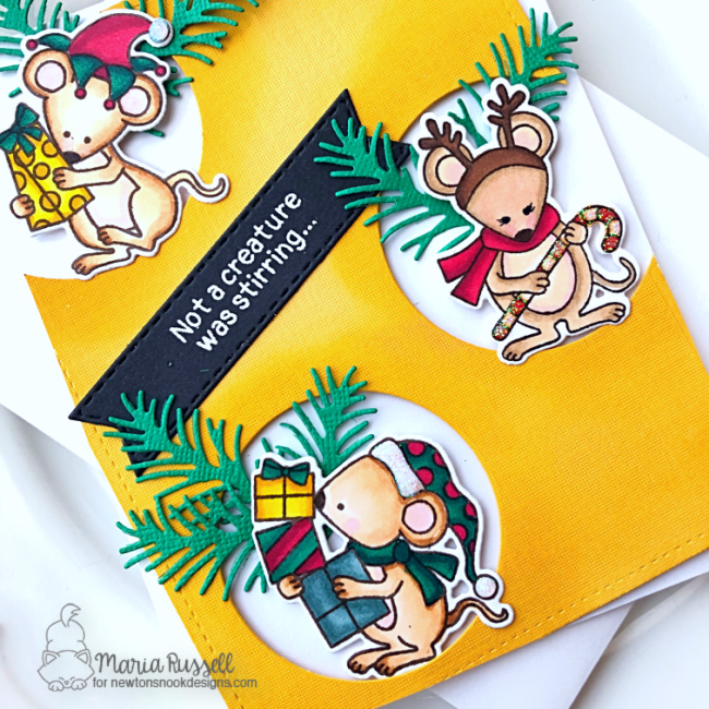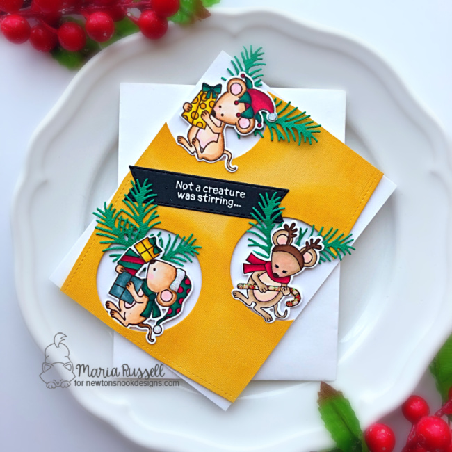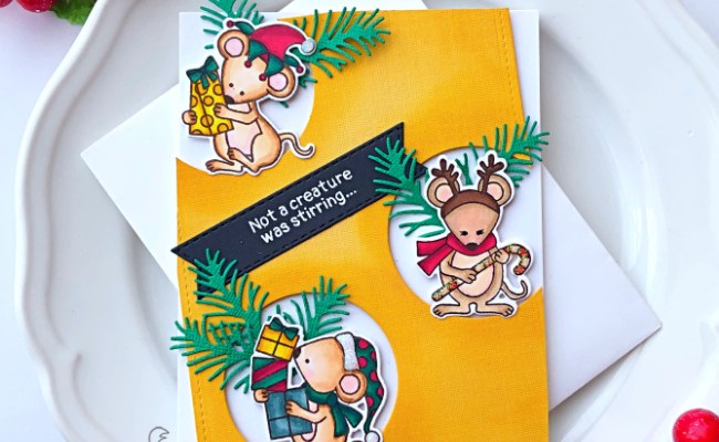 Hello Newton’s Nook fans! I’m back today to share with you this cute “cheesy” Christmas card, showcasing the Naughty & Mice stamp set and coordinating dies, along with the Banner Trio die set, Pines & Holly die set and Circle Frames die set.