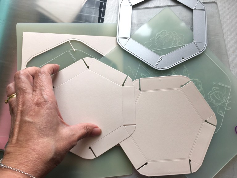 For my Hexagon gift box, I started by die-cutting the box with a die from my stash. I used liquid glue to assemble the box. I would not recommend doing this if you are mass-producing but for the special people in your life, I think it’s wonderful to create something unique and special during the holidays.