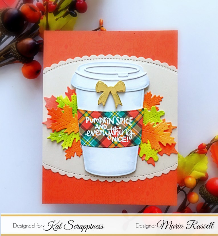 For my project today, I am showcasing the KS Layered Coffee Cup Die, KS Stitched Scalloped Border Die, Newton’s Nook Pumpkin Latte Stamp set (sentiment) and the Stitched Leaves Dies by Lawn Fawn.