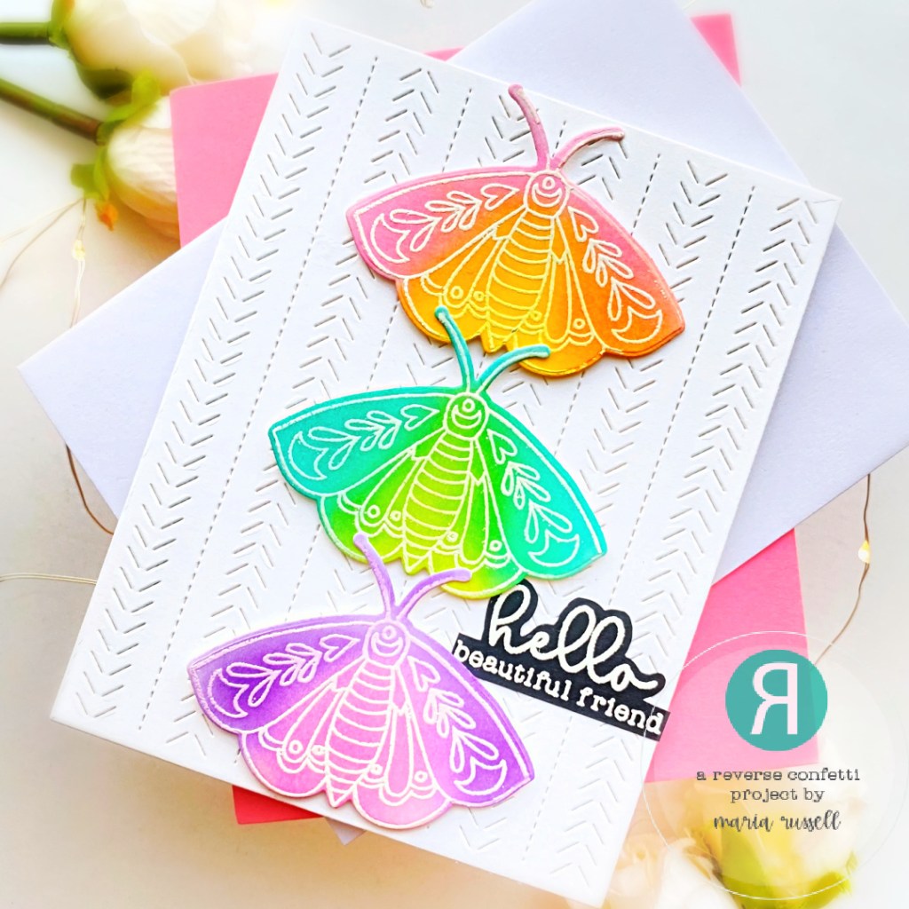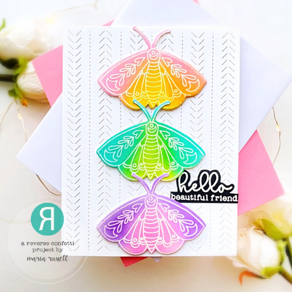 The images from the A Beautiful Day Stamp Set were stamped on some Bristol Smooth White card stock with Versamark ink, and heat-set with heating tool. I used some distress oxide inks to blend the colors on each butterfly, then used the A Beautiful Day Coordinating Confetti Cuts to die-cut the images.