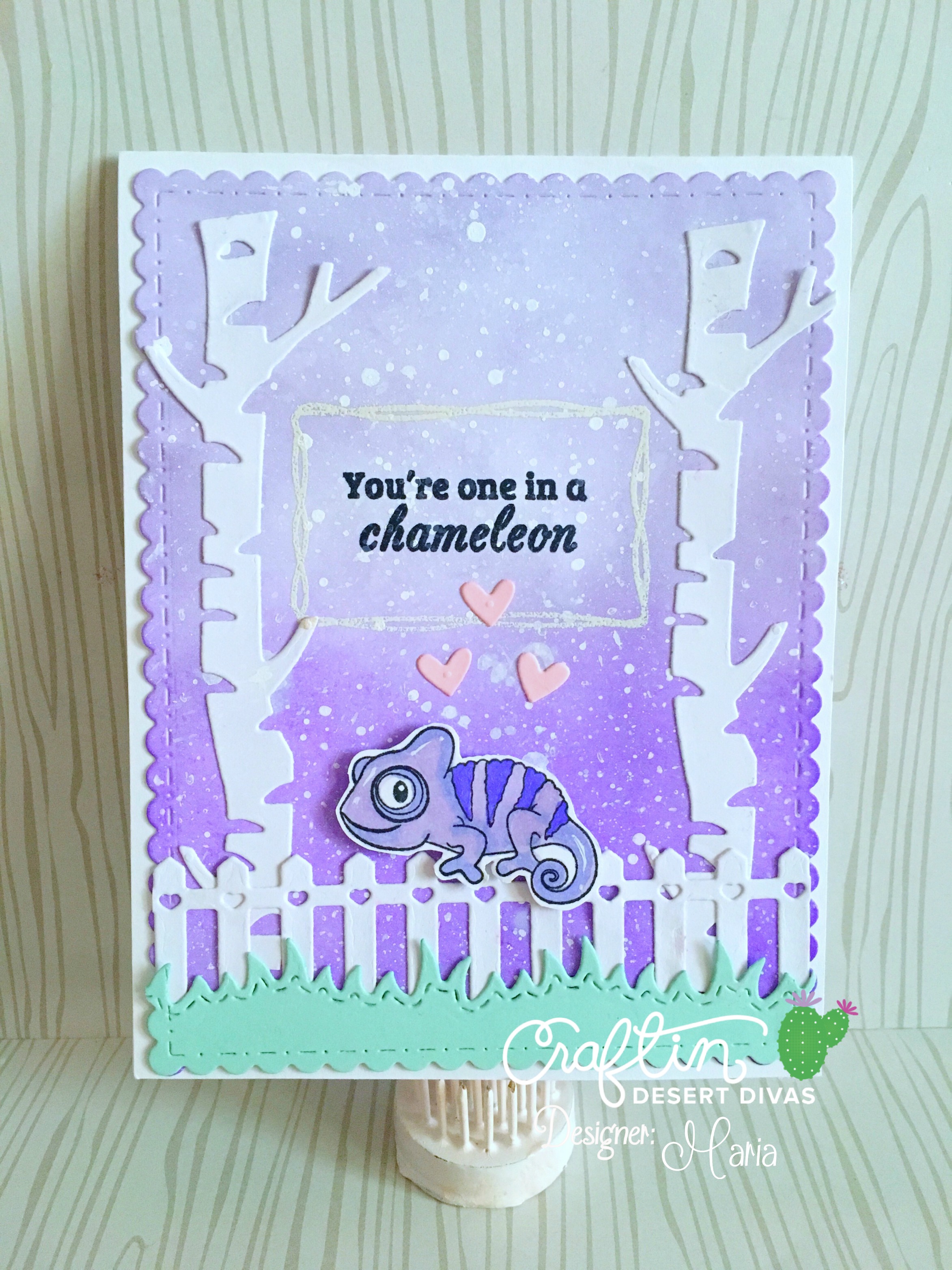 I die-cut my card panel using the stitched rope nested die on Neenah solar white card stock. I then used my mask to cover the Little Stinker image so I can distress the background with my distress inks. I also cut a mask for my grass hill with the masking paper. I used Spun Sugar and Evergreen bough to distress my background. Once I was satisfied with the color combination, I used my paintbrush to splatter some water on my card panel. Distress ink reacts on water and it really gives a cool effect.