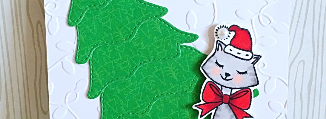 For the first card, I started out by stamping a bunch of the cat images, the ball of yarn, and the presents on Neenah Solar White card stock, using memento tuxedo black ink. I colored the image using my Copic markers. I also die-cut the Christmas tree using the Doodlebug “Here Comes Santa Claus” patterned paper, then adhering the pieces together with my favorite Tombow liquid adhesive.