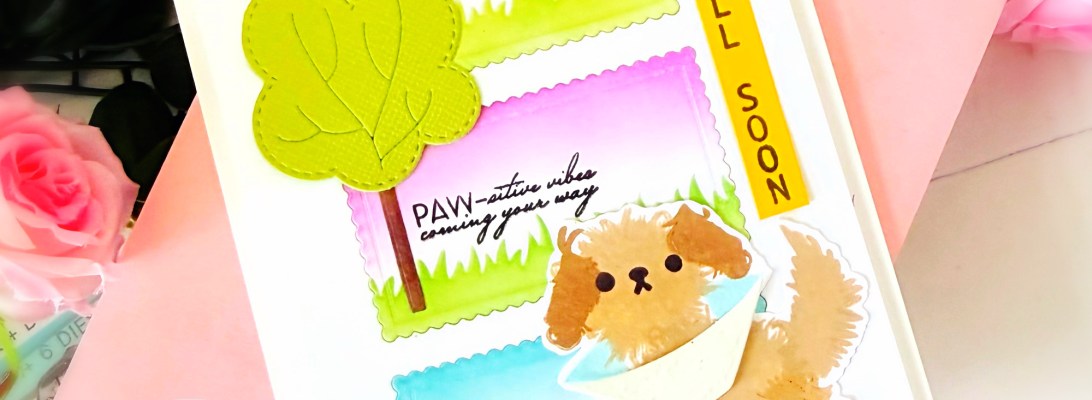 Next, I stamped the little fuzzy dog using the Fuzzy Wuzzies Cone of Shame Stamp Set + Dies and the Cottage Way 4 Color Ink Bundle.  [For reference, the colors I used on the dog were CaraMellow, Milk Chocolate, and Stone Washed Jeans.]  I fussy-cut the dog using precision snips and foam-mounted it on the card.