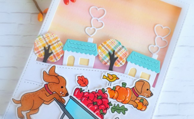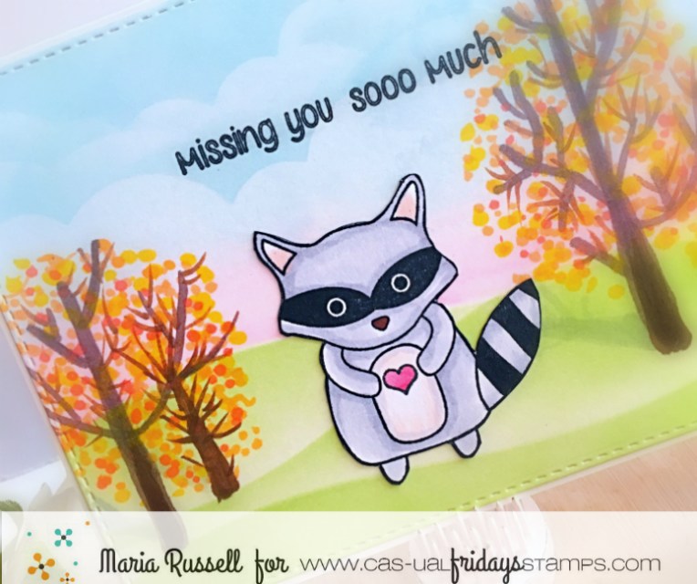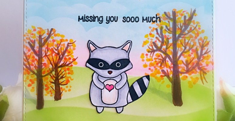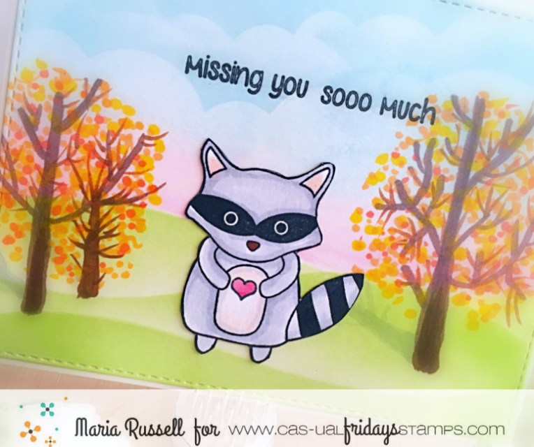 To create my fall scene for my cute critter, I stepped out of my comfort zone and drew some tress and leaves in the background, using my Copic markers. This is the first time I’ve ever drawn a scene from scratch. I got so nervous I thought I was going to hurl, haha! (just kidding) I think it turned out okay, I just need more practice. After all this is “handmade” not Hallmark, right?