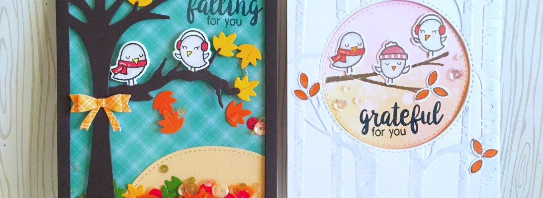 Hello stampers and crafters! I’m back today to share with you two fall cards that I have designed, showcasing Lawn Fawn Winter Sparrows, KatScrappiness Double-Stitched Circle Frames Dies and other products available at the shop.