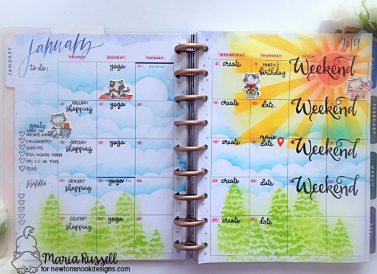 I used the Sunscape Stencil and the Evergreens Stencil with my distress oxide inks to add color to my planner pages. NOTE: Since I am so over the winter-themed cards you will be seeing a lot of sunshine and happiness on my post this week, haha! I also used my home-made clouds stencil using the Sky Borders die. Here’s my monthly calendar spread: