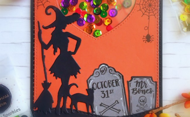 I adhered the die-cuts onto my colored background and added the big hill, then adhered this piece on my card base. I used my powder tool to get rid of some static and stamped my sentiment onto the card with some white embossing powder and heat-set it with my heating tool. I adhered my stamped images onto the card. To finish the design, I used my black glazed pen to give the eye a little more dimension.