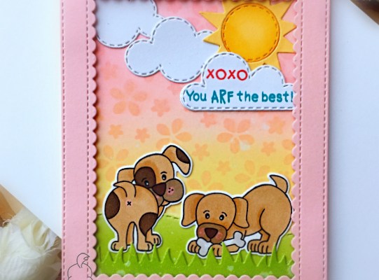 Both cards are fairly simple. I started by die-cutting the circle scallop using the biggest die from the Circle Frames die set. I positioned this inside my stamping tool and stamped the images with Memento Rich Cocoa ink. I colored the images in with alcohol markers.