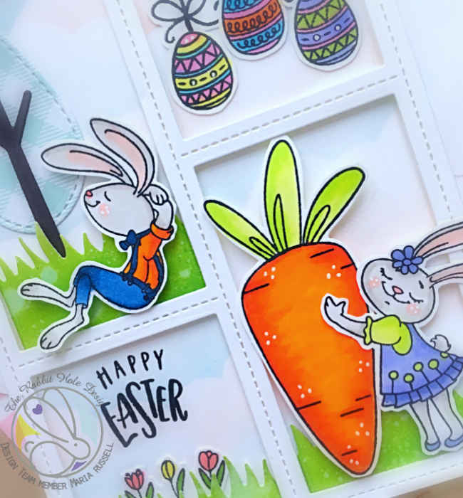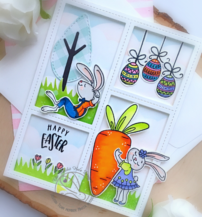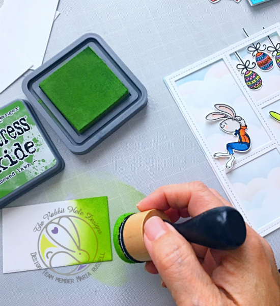 For my second card, I used the Garden Mice stamp set and coordinating die, with the grass border die and the Leafy Tree Trunk Embossing folder. The clouds are from the Newton Scoots By stamp set.