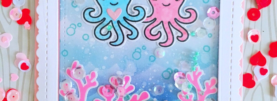 I started out by die-cutting my shaker panel using the new Stitched Fancy Scalloped Rectangle Dies, with the Stitched Rectangle dies. I also used my acetate sheet to adhere to the panel to create the window for my shaker card. I stamped my images on Neenah solar white card stock and colored my Octopi with my Copic markers. I also stamped the coral images from an older Lawn Fawn Mermaid For You stamp set. I die-cut the images using the coordinating dies.