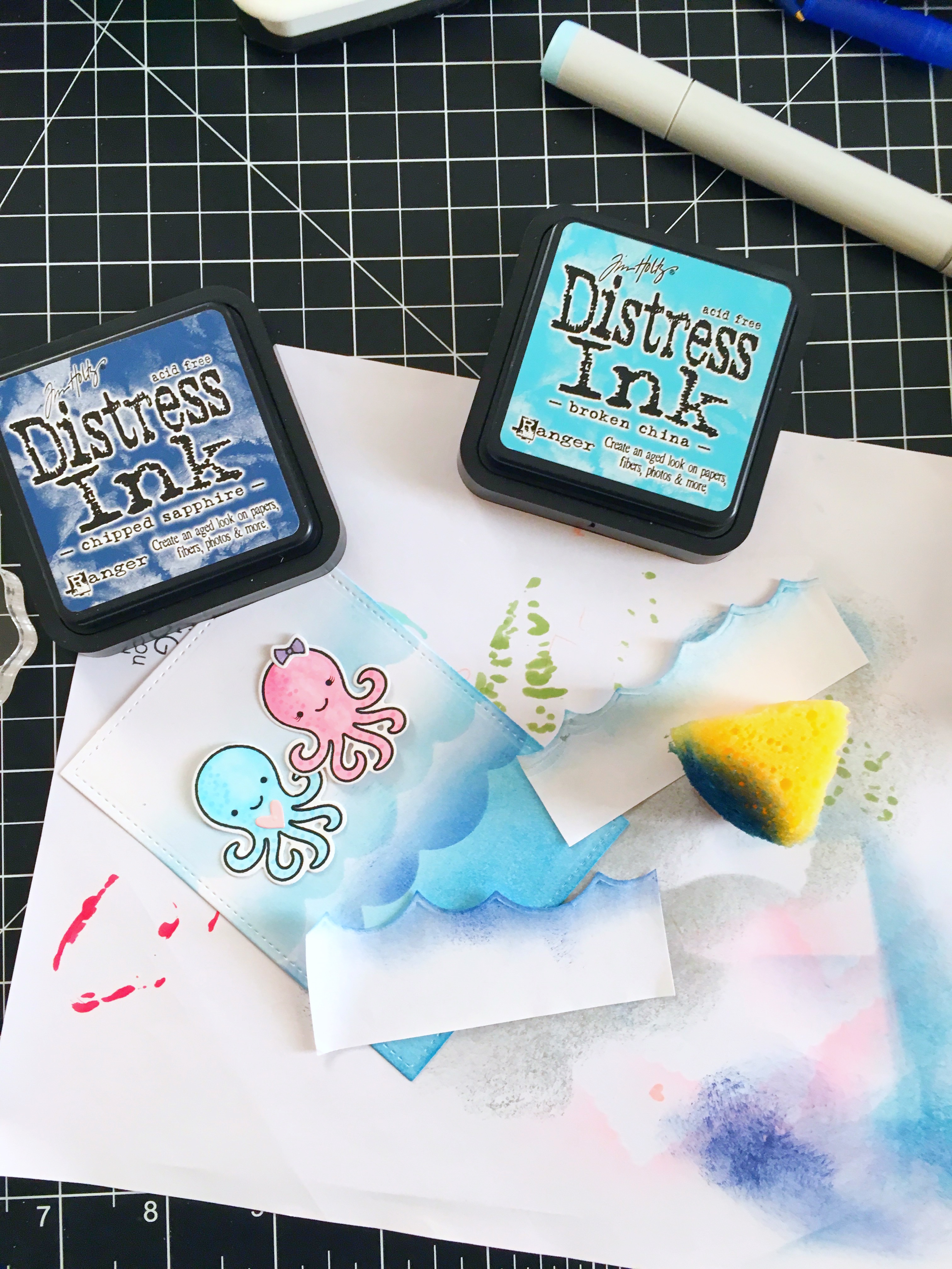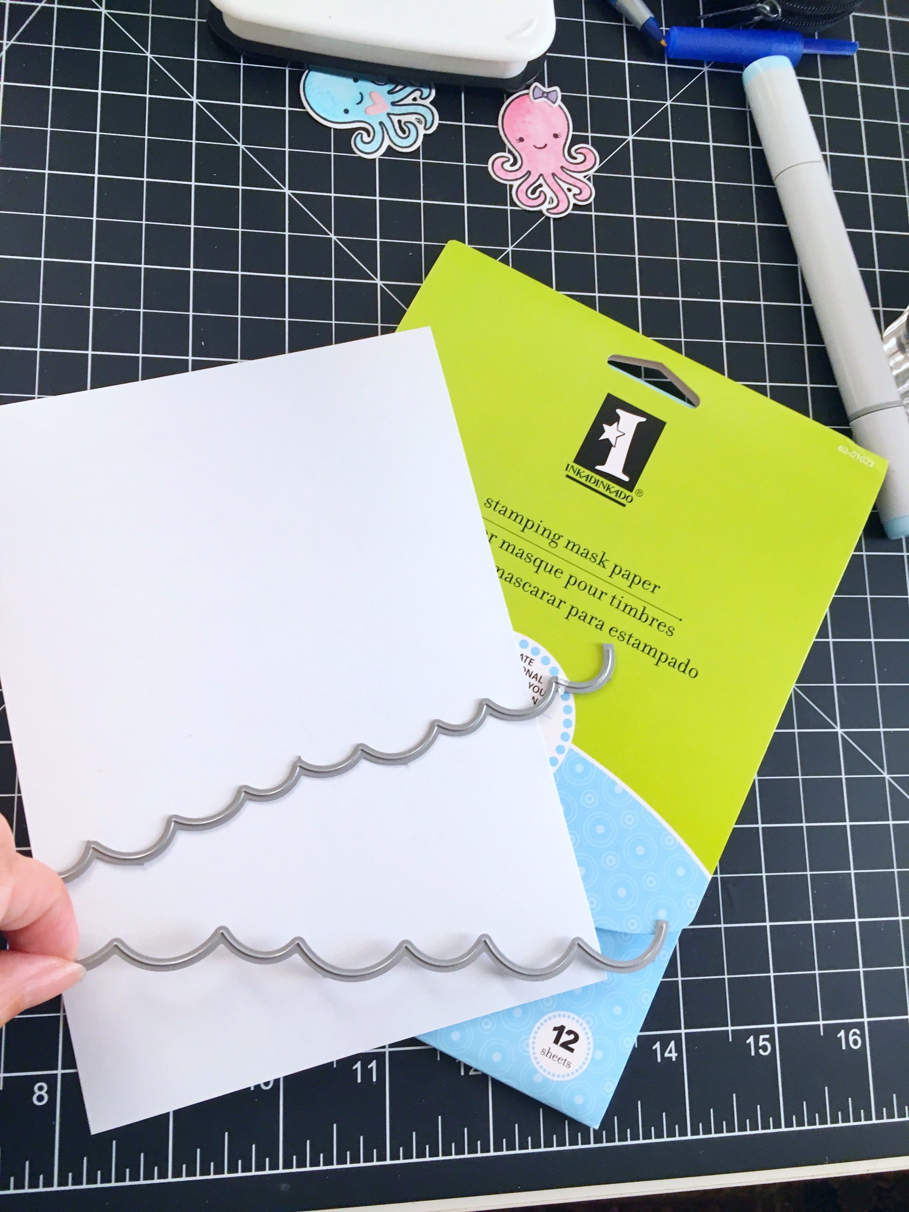 I wanted to color my card stock using the stitched wave border dies to create some waves, so I used the Inkadinkado Masking paper to cut out my mask. I used my distress inks to color the background. I splattered some water using my watercolor brush to create “bubbles”. Somehow it didn’t look like I had enough bubbles so I used my Copic White Opaque paint and splattered some white paint all over my background. This made it look more realistic!