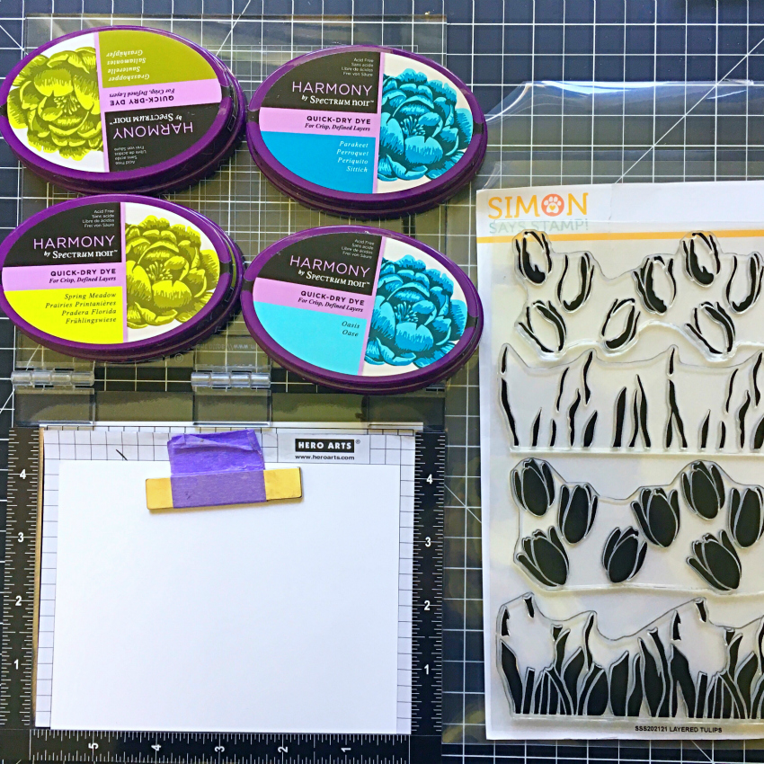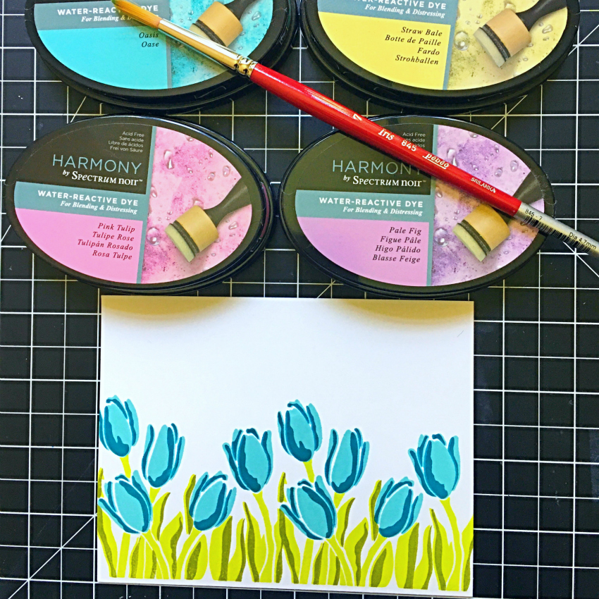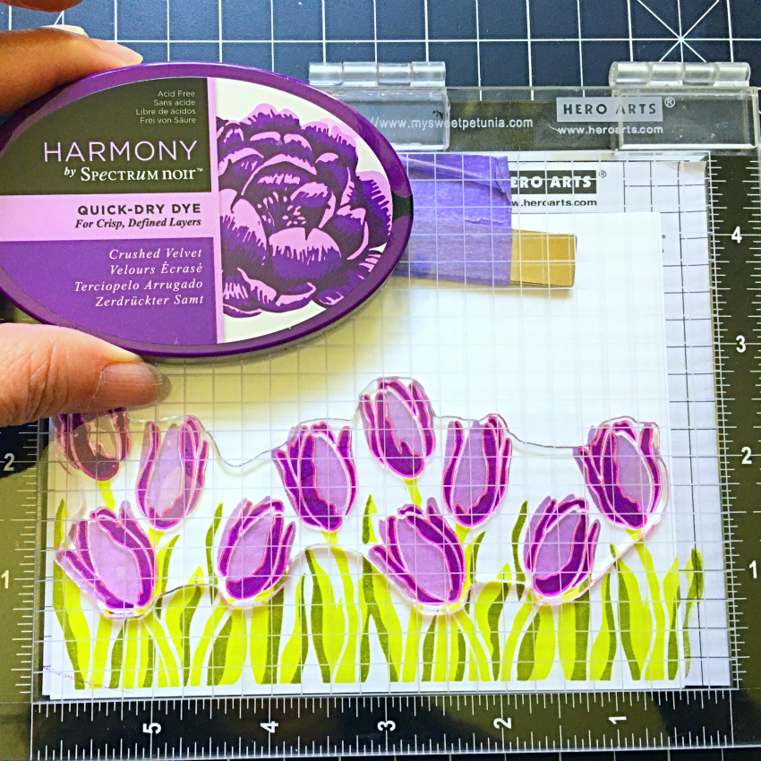 Choose 2 colors of Spectrum Noir Quick Dry Dye inks for each color family to use for the cards today. For the blues, I used Oasis and Parakeet. Green – Spring Meadow and Grasshopper. Yellows – Straw Bale and Honeypot. Pinks – Pink Tulip and Fuchsia and Purple – Pale Fig and Crushed Velvet.