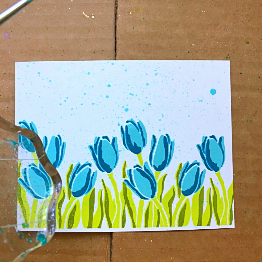 Press the ink pad onto an acrylic block and add some water to dilute the color. Use a watercolor brush to splatter color onto the card panel.