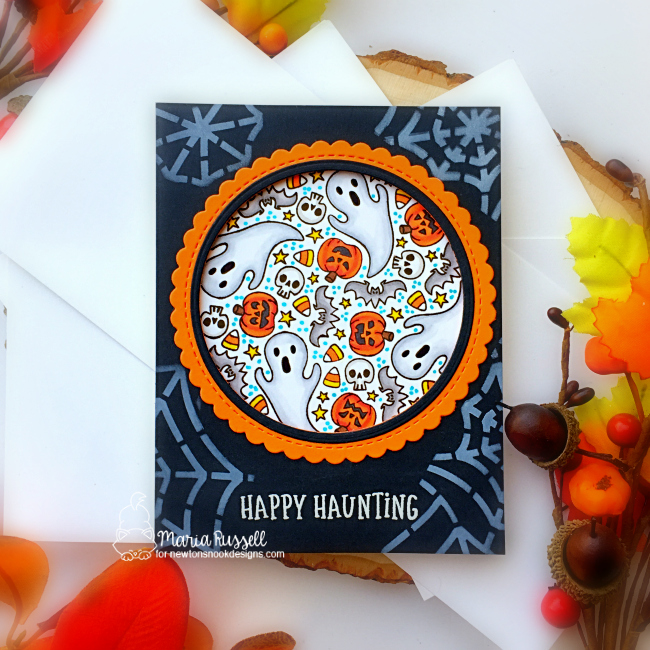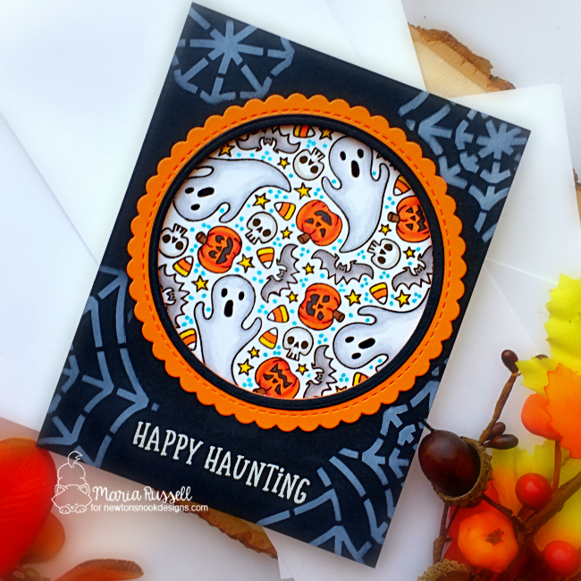 The background was created by using the Spiderweb stencil and some light gray dye ink. I cut this panel to 4 1/4 by 5 1/4 and adhered on an A2 size panel, that was colored with the Houndstooth stencil. I die-cut some black strip and adhered onto the card with liquid glue. I also die-cut some black party streamers using a die from my collection and the bats using the Halloween Trio die set.