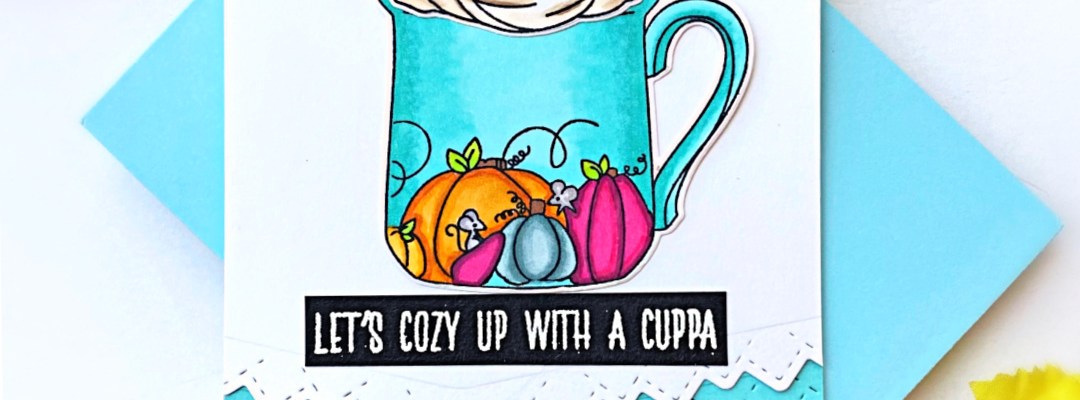 For my card today, I am showcasing the Cozy Cuppa stamp set and coordinating dies, Doodle Border 4×6 stamp set along with the Offset Slimline Stack-ables Die Set that is part of the Pastry Pals Craft Kit and the Happy Fall 6×6 Paper Pad.