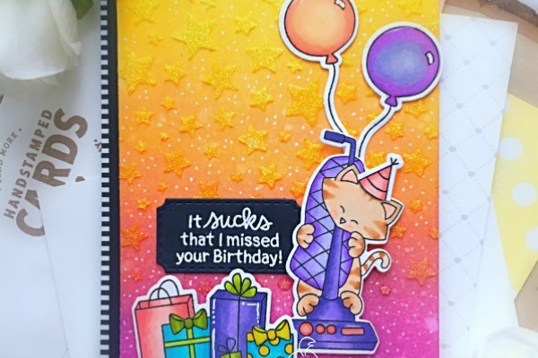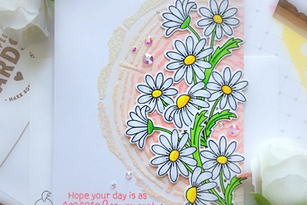 I finished my design by stamping the sentiment and colored the letters with Copic markers. I also used my white gel pen to add more details to the pineapple and hibiscus. Here’s a closer look: