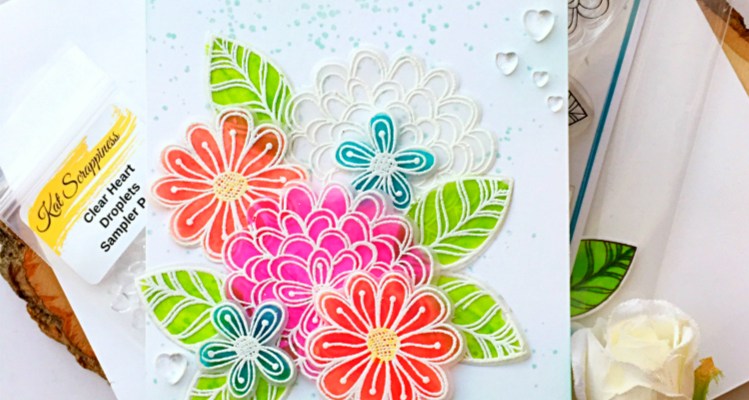 To finish my design, I stamped the sentiment with Versafine Onyx Black ink and added the Sparkling Hearts droplets on the card.  Here’s another look:
