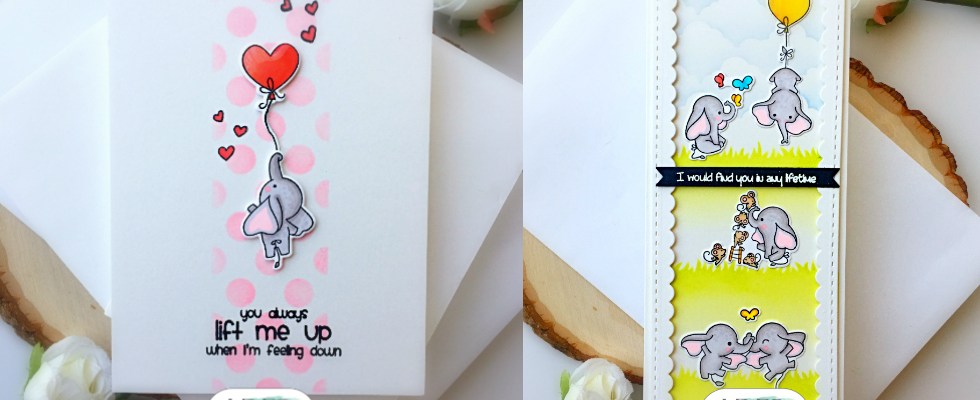 The first card was ink-blended using the Playful Patterns stencil and Pink Tutu hybrid ink. I wanted a subtle background against the cute elephant being carried away by the balloon. The sentiment and the hearts were stamped using some Raven hybrid ink. Here’s a closer look: