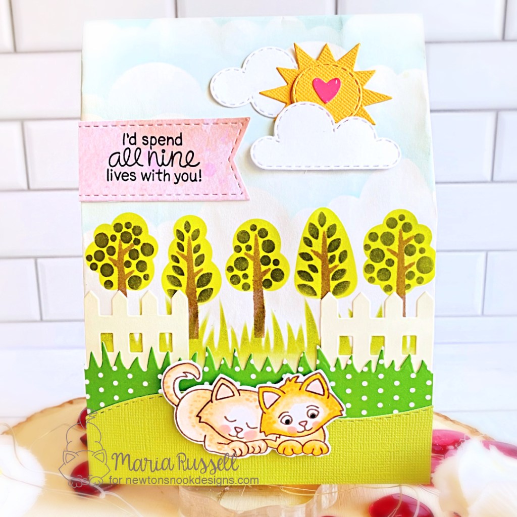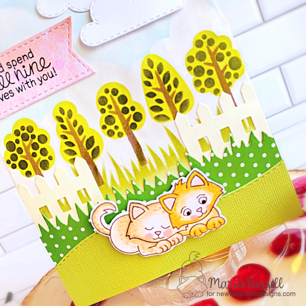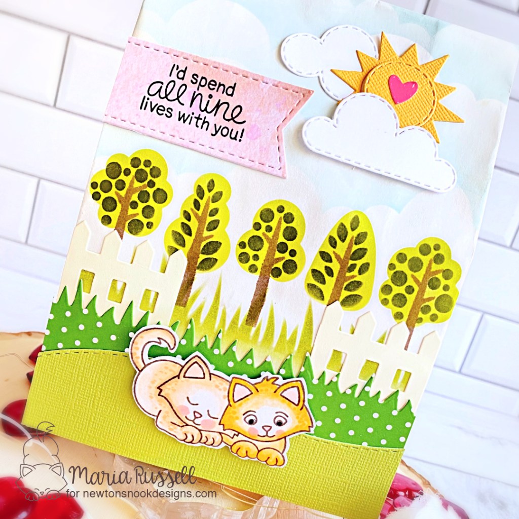 For my project today, I am showcasing the Smitten Kittens stamp set and coordinating dies, along with the Tree Line Stencil, Clouds stencil, Hills & Grass Stencil, Newton’s Sweetheart stamp set, Land Borders Die Set, Fence Die, Frames & Flags Die Set and Sky Scene Builder Die Set. [Can you tell I had a lot of fun mixing and matching these products to create the beautiful scene?!]