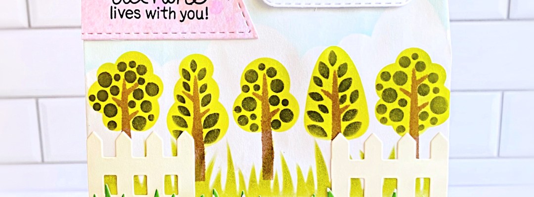 For my project today, I am showcasing the Smitten Kittens stamp set and coordinating dies, along with the Tree Line Stencil, Clouds stencil, Hills & Grass Stencil, Newton’s Sweetheart stamp set, Land Borders Die Set, Fence Die, Frames & Flags Die Set and Sky Scene Builder Die Set. [Can you tell I had a lot of fun mixing and matching these products to create the beautiful scene?!]