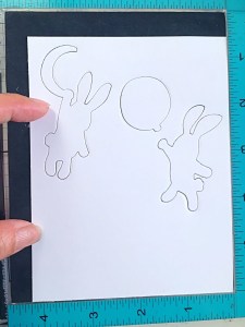To make my card, I used a clouds stencil from my collection to ink up some Bristol Smooth white card stock using Worn Lipstick, Mustard Seed and Speckled Egg distress oxide inks. I stamped my image from the Somebunny Stamp set and used my precision snips to fussy-cut the image. I used glossy accents for added texture to the balloon. I set this aside to dry for about half an hour.
