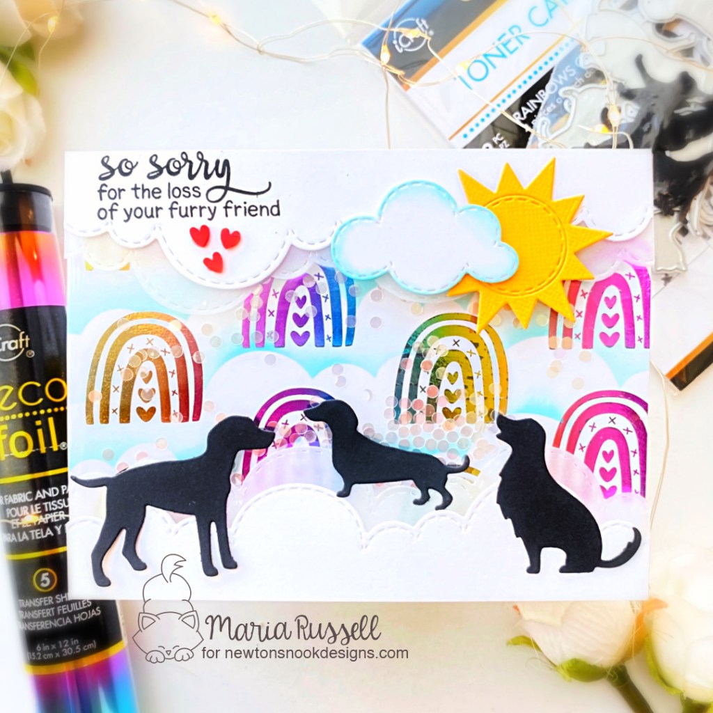 For all the cards today, I’m showcasing the Dog Silhouette Die Set, Cat Silhouette Die Set, along with the Furr-Ever Friends Stamp Set, Sky Scene Builder Die Set, Clouds Stencil, Sky Borders Die Set, Frames and Flags Die Set, Pawprints Shaker Die Set with Therm-O-Web’s DecoFoil A2 Toner Card Fronts Rainbows Galore, DecoFoil Transfer Sheets Mystic Rainbow and iCraft Easy-Cut Adhesive Sheets.