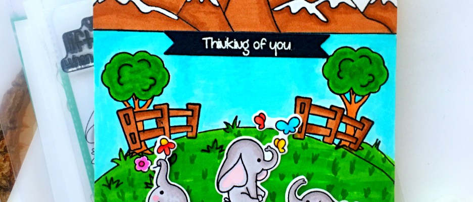 I stamped the images with Raven Hybrid ink on some white card stock. I also stamped the tree and picket fence from the Thank Ewe stamp set on some masking paper to mask the images. I colored the images in with my alcohol markers and used the Up & Away coordinating die to cut them out.